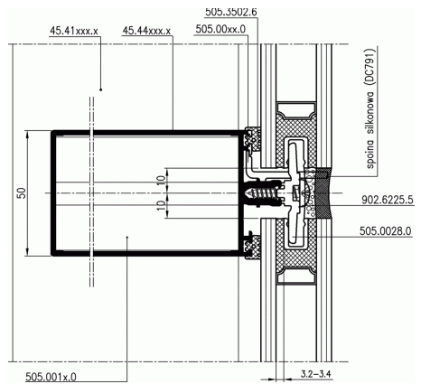 Fasada FA 50 wariant SL – przekrój przez poprzeczkę fasadowy